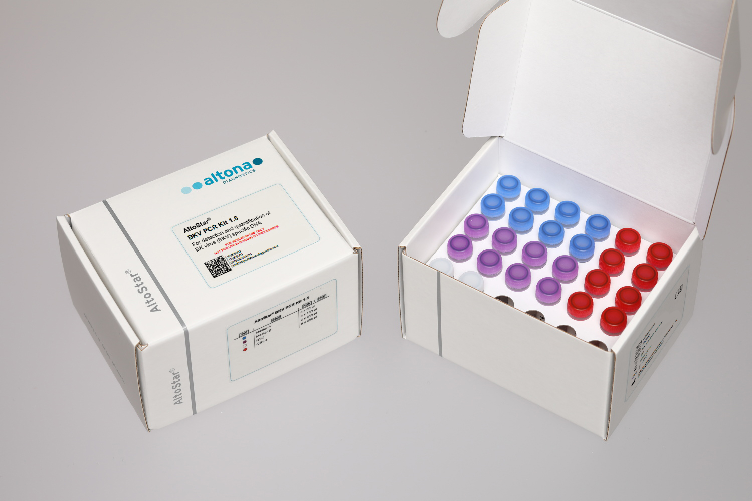 The AltoStar® BKV PCR Kit 1.5 is a reagent system, based on real-time PCR technology, for the detection and quantification of BK virus (BKV) specific DNA.