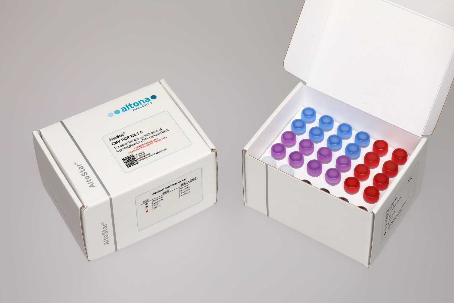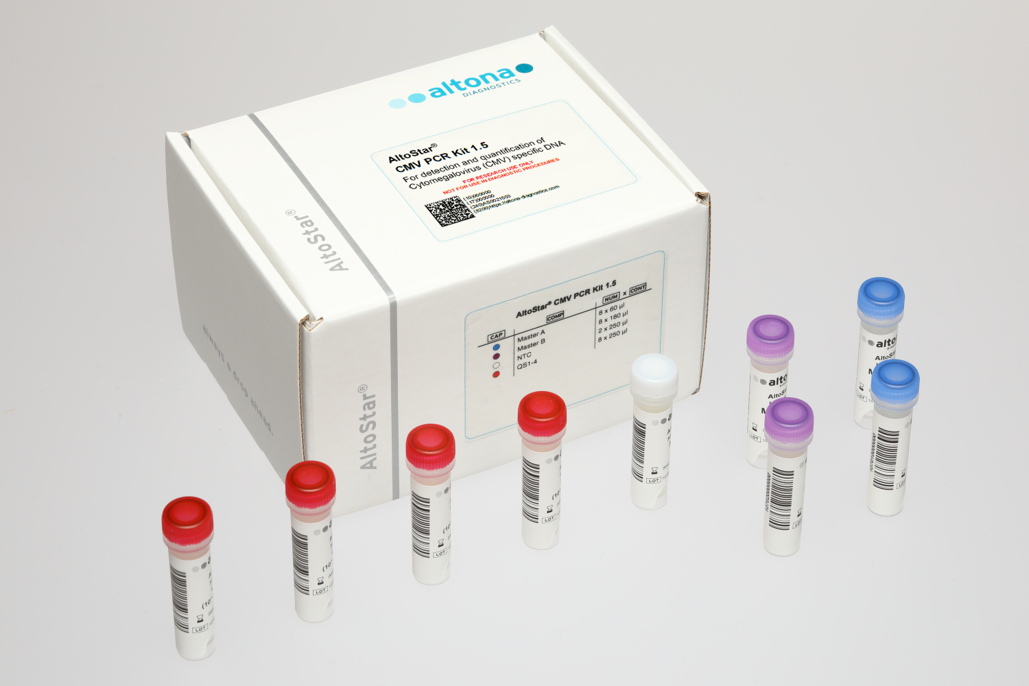 The AltoStar® CMV PCR Kit 1.5 is a reagent system, based on real-time PCR technology, for the detection and quantification of cytomegalovirus (CMV) specific DNA.
