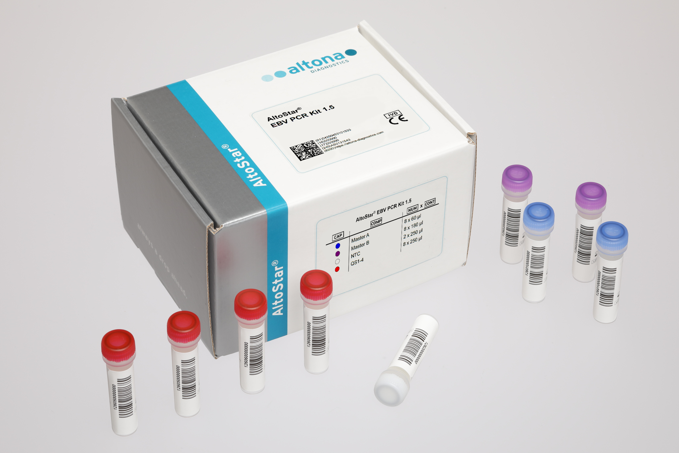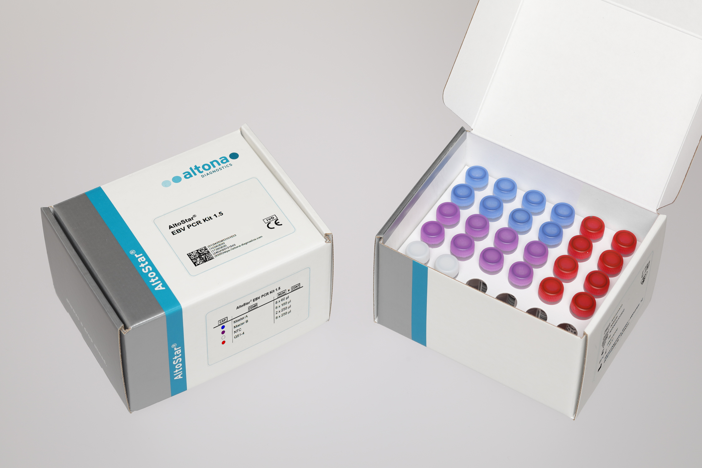 The AltoStar® EBV PCR Kit 1.5 is an in vitro diagnostic test, based on real-time PCR technology, for the detection and quantification of Epstein-Barr virus specific DNA in human plasma and whole blood. It is intended to be used as an aid for diagnosis of EBV infection and for monitoring of the EBV load in individuals with EBV infection.