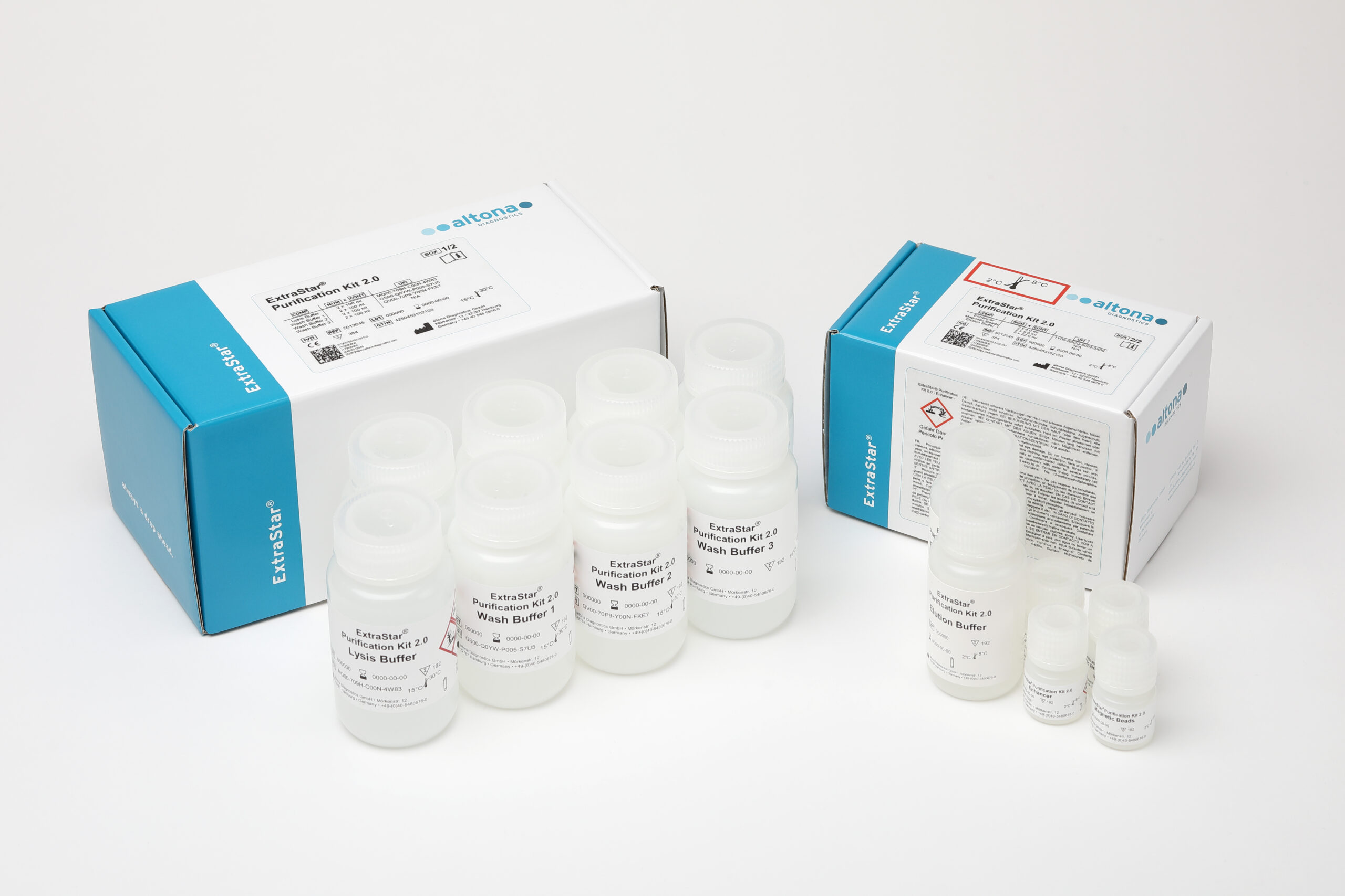 The ExtraStar® Purification Kit 2.0 uses magnetic particle technology and is intended to be used for the automated isolation and purification of nucleic acids from human respiratory swab specimens for in vitro diagnostic purposes. The product is designed for use with the KingFisher™ Flex Purification System (Thermo Fisher Scientific) and altona Diagnostics kits and reagents specified for use with the ExtraStar® Purification Kit 2.0.