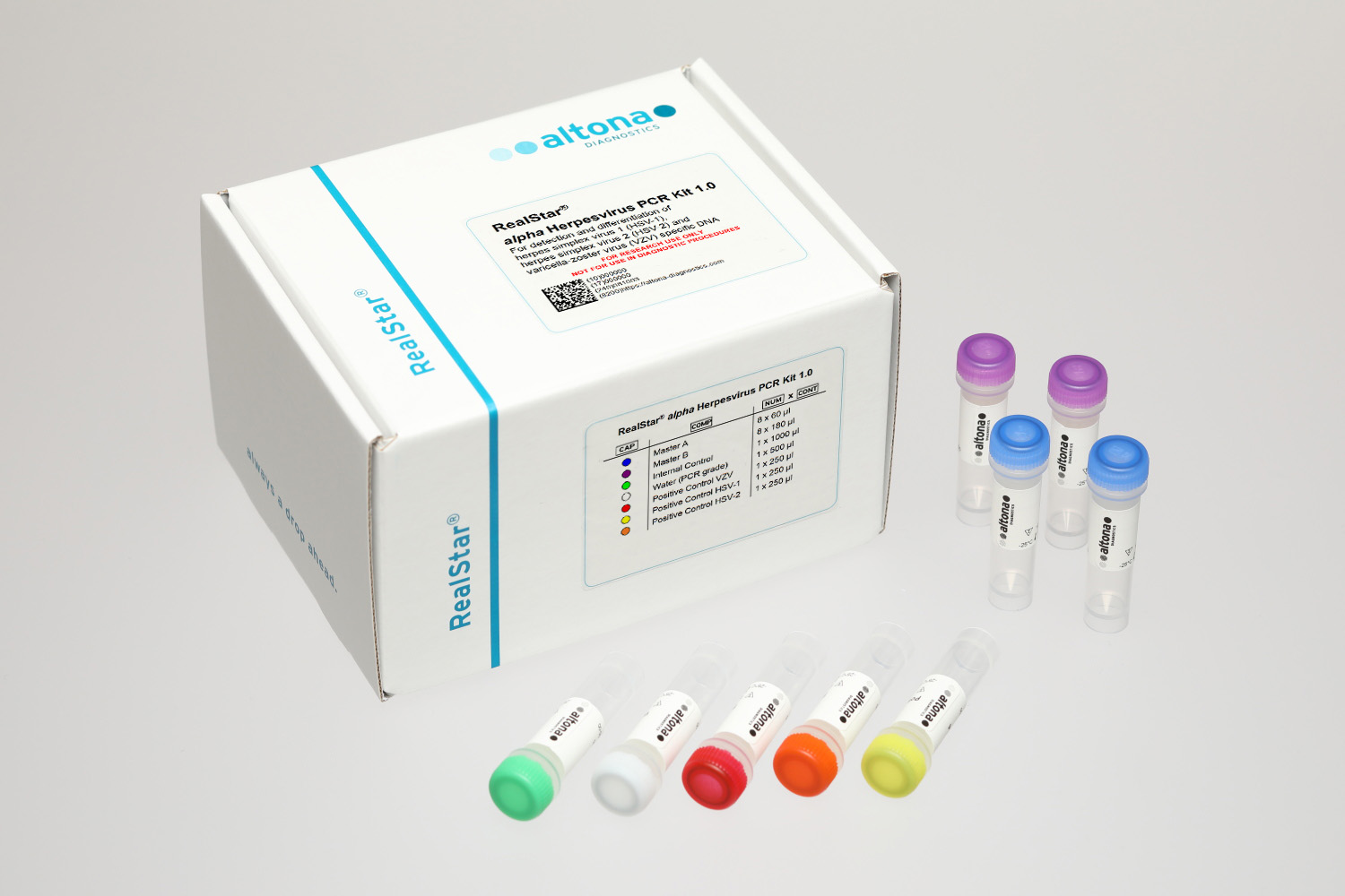 The RealStar® alpha Herpesvirus PCR Kit 1.0 is a reagent system, based on real-time PCR technology, for the detection and differentiation of herpes simplex virus 1 (HSV-1), herpes simplex virus 2 (HSV-2) and varicella-zoster virus (VZV) specific DNA.