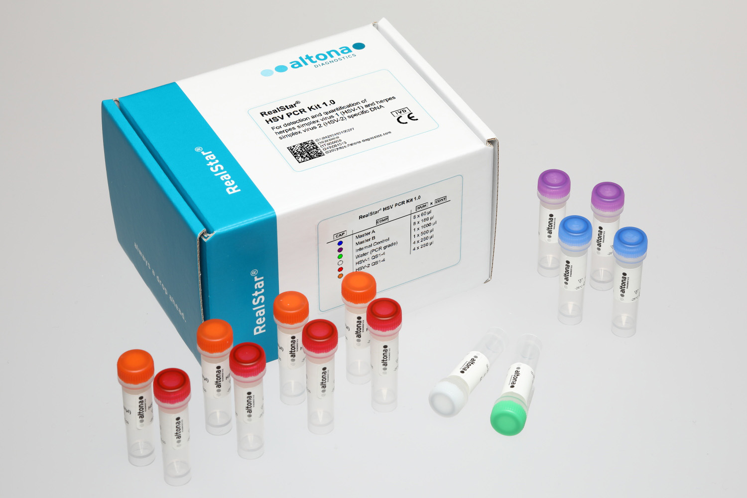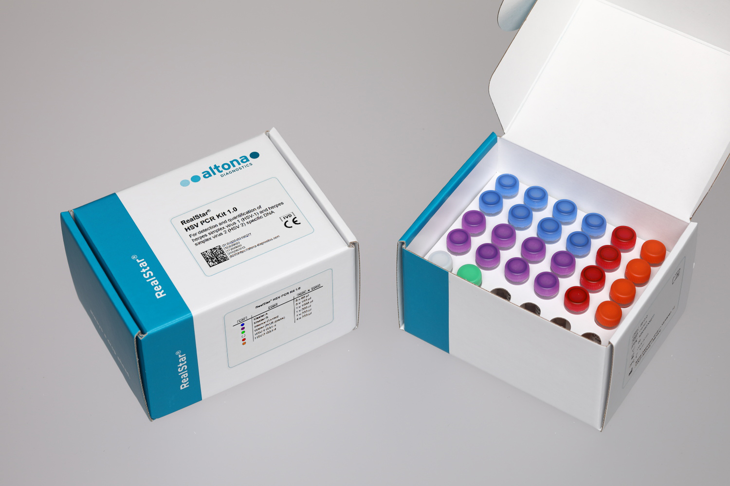 The RealStar® HSV PCR Kit 1.0 is an in vitro diagnostic test, based on real-time PCR technology, for the simultaneous detection and quantification of herpes simplex virus 1 (HSV-1) and herpes simplex virus 2 (HSV-2) specific DNA.